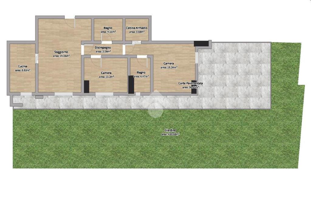 In un contesto residenziale tranquillo e ben curato, proponiamo in vendita un appartamento trilocale al piano terra, caratterizzato da ambienti funzionali e ottime finiture. L’ingresso si apre direttamente sulla zona giorno, composta da un ampio salone e da una cucina separata e abitabile. La pavimentazione in gres porcellanato chiaro dona luminosità e continuità agli spazi. La zona notte, distinta da un elegante parquet nei toni del miele, è composta da una camera da letto matrimoniale e da una cameretta, entrambe con porta finestra che permette l’accesso diretto al giardino privato.