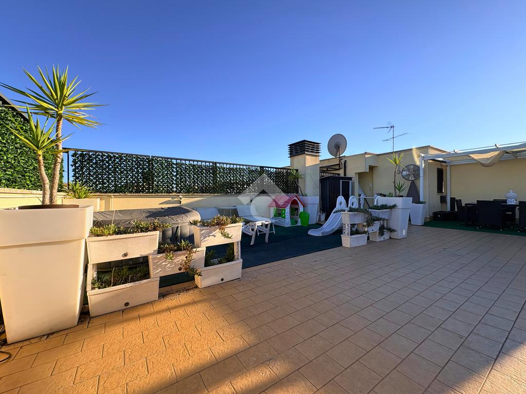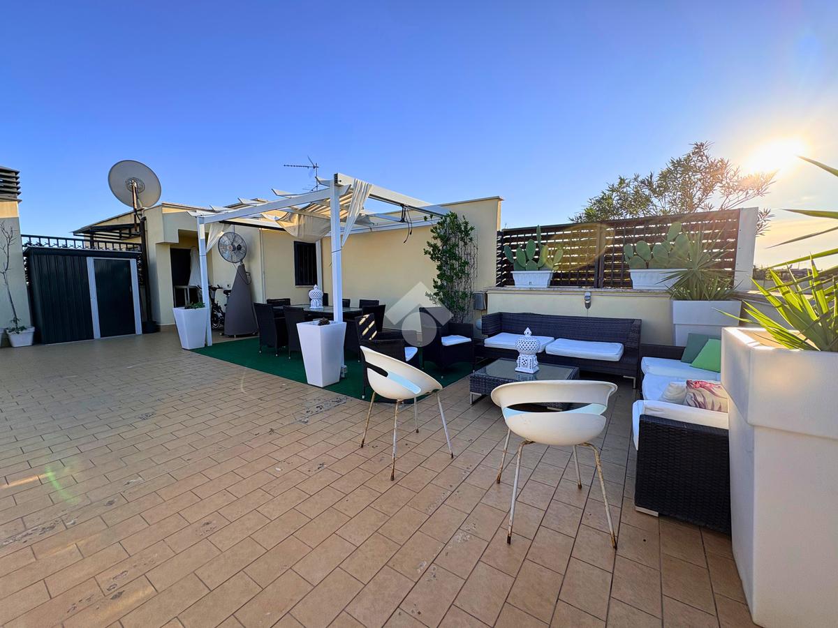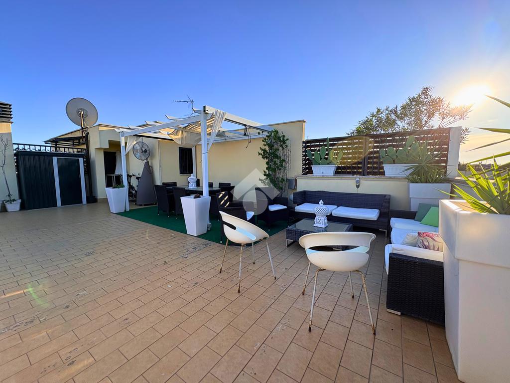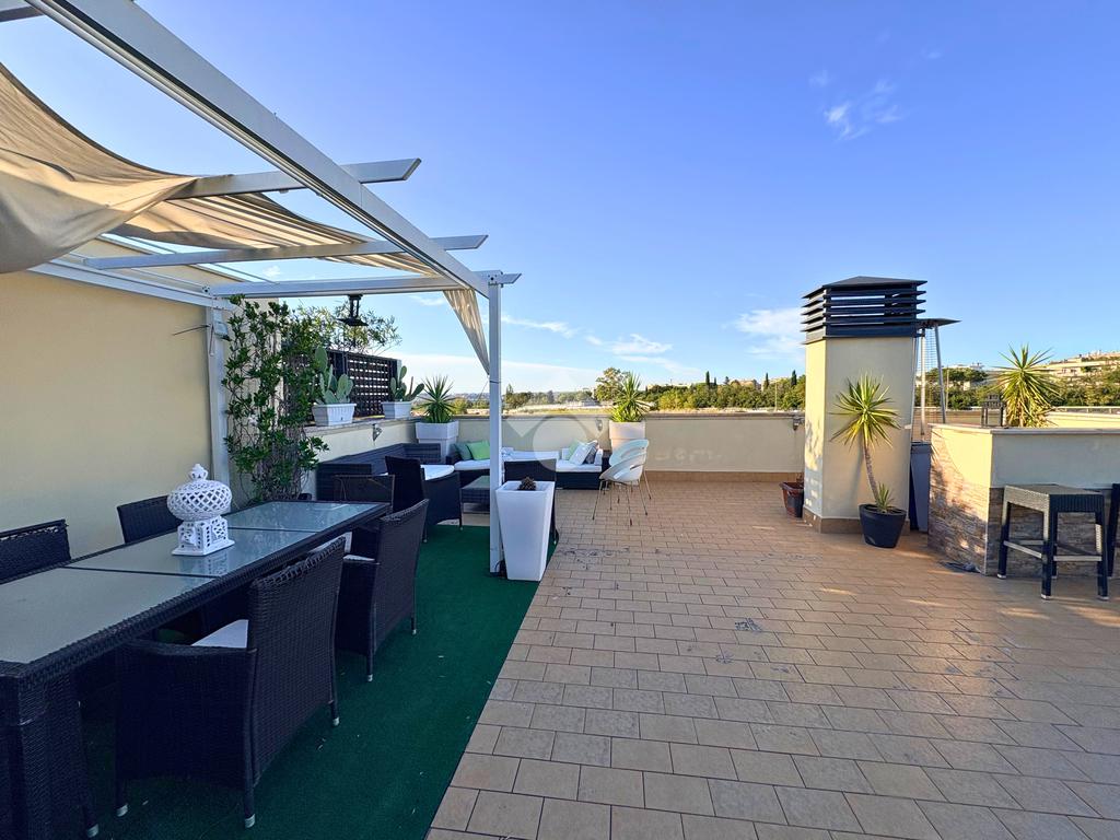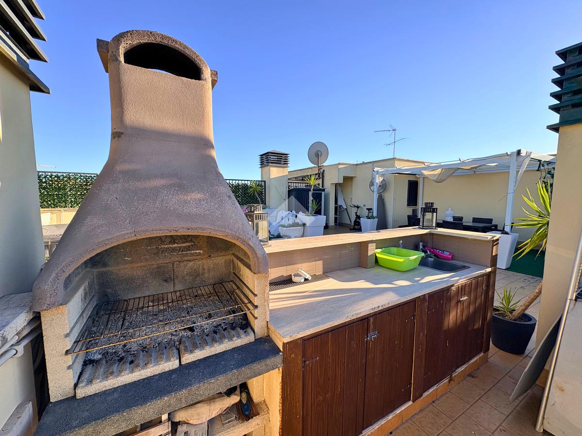 Salendo al piano super attico, il cuore della casa si svela in tutta la sua bellezza: un grande terrazzo panoramico con barbecue, uno spazio aperto che diventa il palcoscenico perfetto per cene estive, feste o semplicemente per ammirare il cielo al tramonto.
